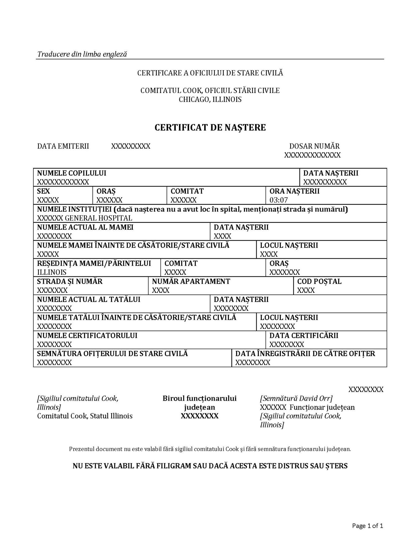 EN-RO translation of a Birth Certificate issued in 2012 by the Authorities in Chicago, Illinois.