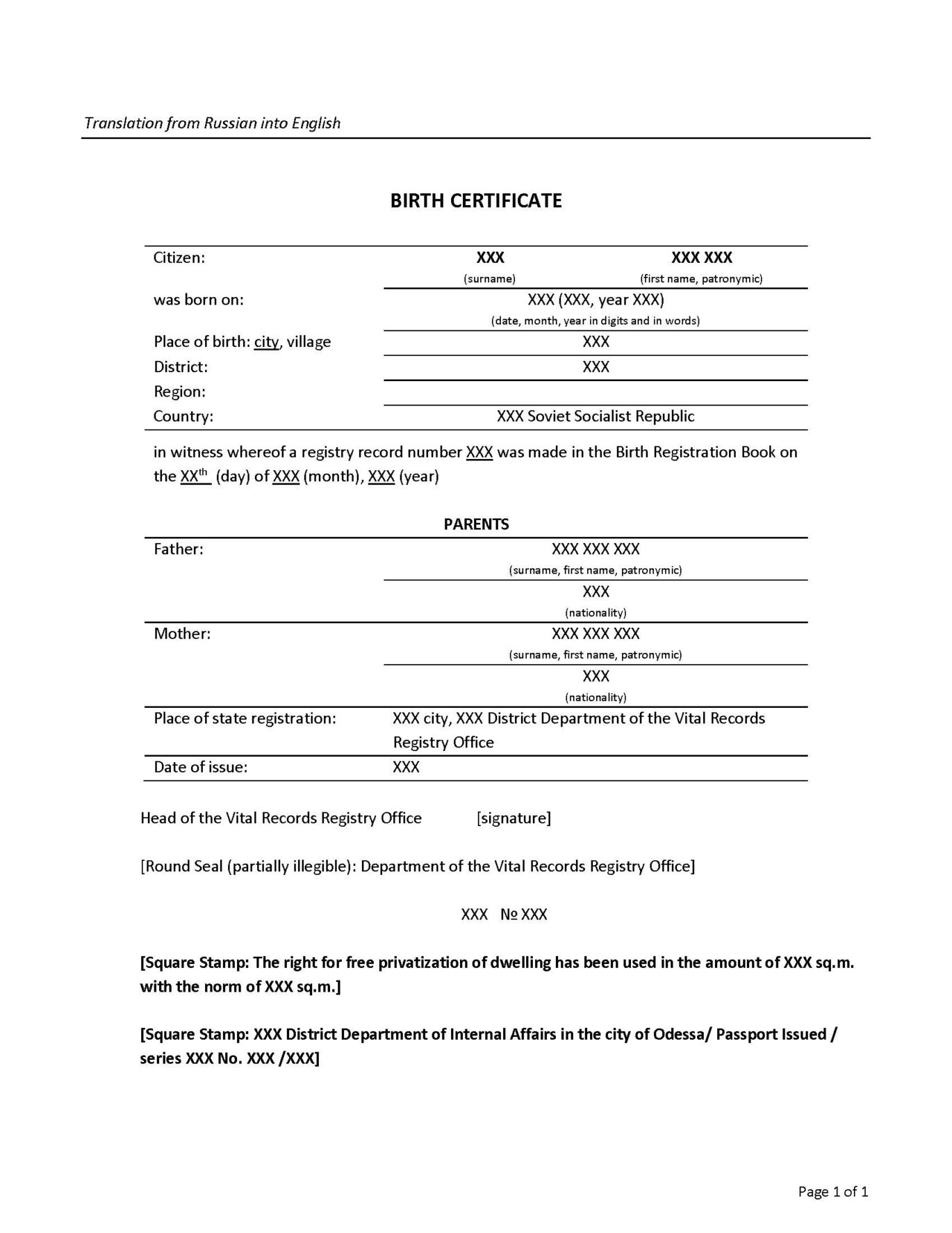 Birth Certificate RU-EN 1980